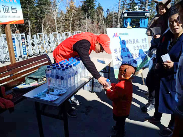 志愿服務(wù)隊員們天不亮就進入北景區(qū),分別在山門和換乘中心設(shè)立“黨員先鋒崗咨詢臺”,為游客們提供義務(wù)咨詢,并為老年和兒童們免費發(fā)放了盛滿愛心的礦泉水,切實地幫助游客解決了許多問題,充分展現(xiàn)長白山的服務(wù)理念和宗旨,也快速的與游客間搭建起了“友誼之橋”,受到了廣大游客的普遍贊譽。