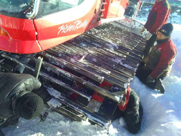 11月16日清晨,雪地車在長白山北主峰公路黑風(fēng)口清雪作業(yè)時(shí),出現(xiàn)前拐軸折斷故障,無法繼續(xù)正常作業(yè)。北景區(qū)檢修部接到報(bào)告后,迅速抽調(diào)經(jīng)驗(yàn)豐富的檢修技工攜帶搶修工具和配件前往現(xiàn)場展開維修。